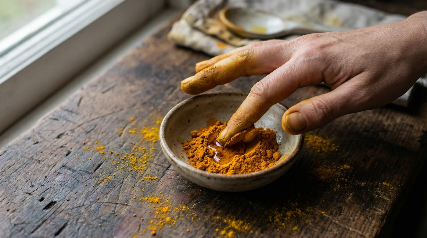 Bu altın rengi tozu günlük akşam ritüeline dahil etmek, karmaşık bir kimya deneyinden ziyade, sadece kendine ayırdığın şefkatli, topraklayıcı bir terapi seansına dönüşmeli. Küçük bir porselen kasede, silme bir çay kaşığı saf organik toz zerdeçalı, bir tatlı kaşığı süzme yoğurt ve yarım çay kaşığı ham bal ile yavaşça karıştır. Tahta bir kaşığın sırtıyla malzemeleri birbirine yedirirken çıkan o hafif sesi dinle. Yoğurttaki laktik asit, cildini kurkuminin girişine hazırlayan nazik bir kapı açıcı görevi görürken, bal cildin kendi doğal nemini derinlere hapseder.