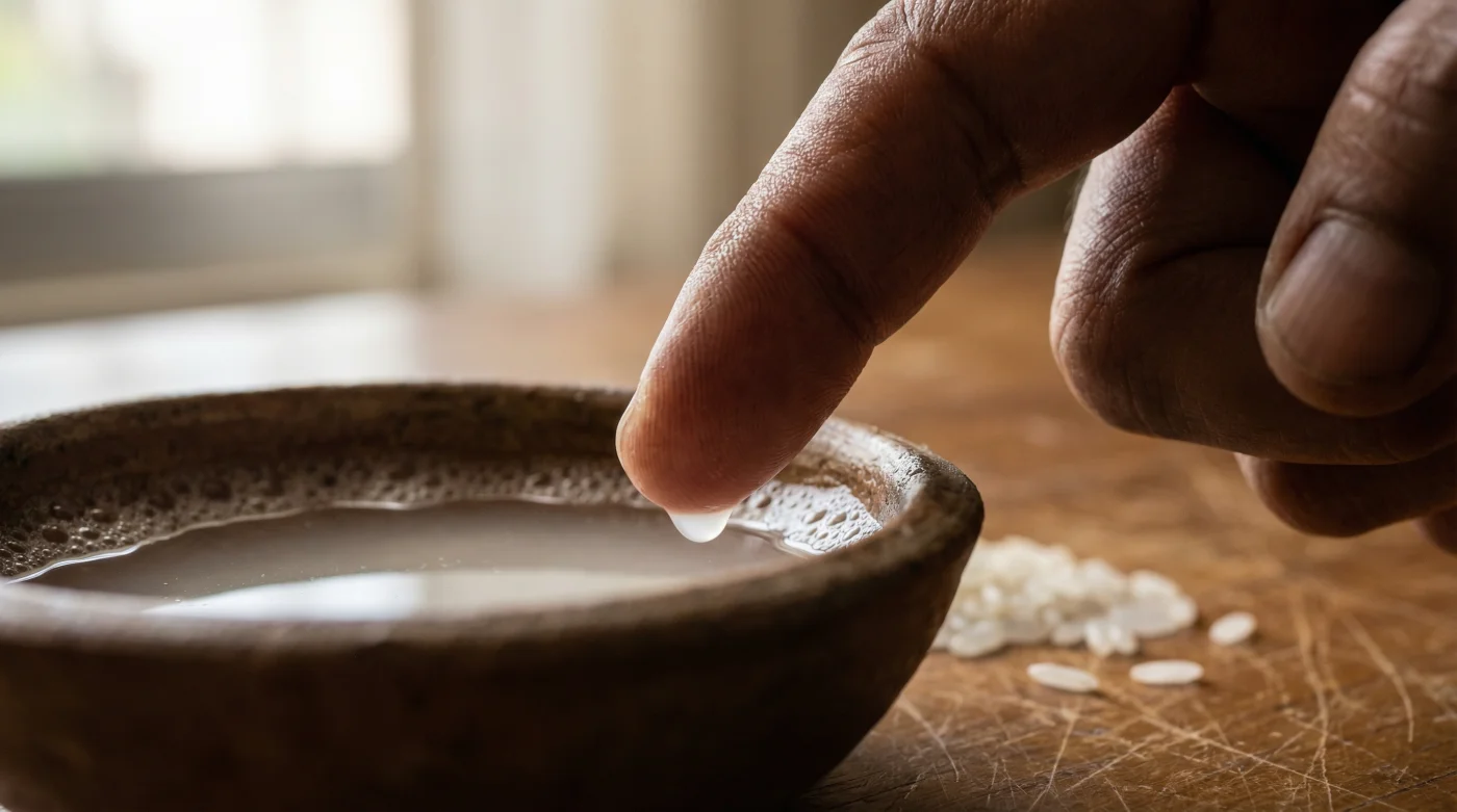 Şimdi bu bilgiyi fiziksel bir eyleme dönüştürelim. İhtiyacın olan tek şey, organik, işlem görmemiş yarım çay bardağı pirinç ve iki çay bardağı temiz içme suyu. Öncelikle pirinci bir kapta suyla hafifçe yıka ve bu ilk suyu dök; bu sadece yüzeydeki tozu temizler. Ardından pirinci temiz bir cam kavanoza al, üzerine içme suyunu ekle ve parmaklarınla pirinçleri hafifçe ovala. Suyun yavaş yavaş süt beyazı bir renge döndüğünü göreceksin.